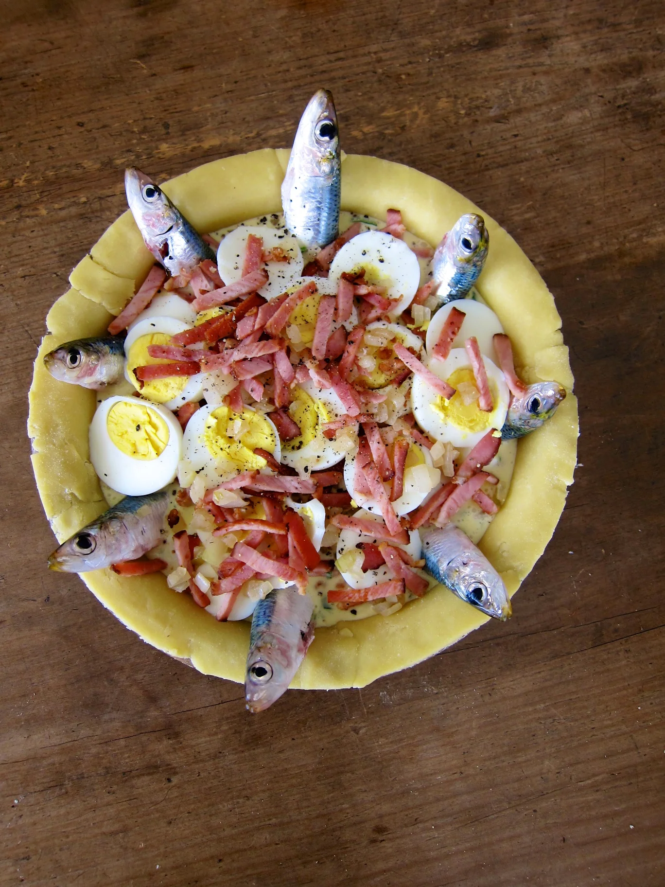 Pre-heat the oven to 180°C and grease a 23-cm pie dish. Roll two-thirds of the pastry until 3-mm thick and use it to line the pie dish. Arrange the sardines in a clock-like pattern and then pour over the filling. Top with the reserved bacon and hard-boiled eggs. Roll the remaining pastry into a circle 3-mm thick and cut eight slits ~3-cm from the edge. Place the pastry on top of the pie and pull the heads of the sardines through the slits. Crimp the edges, brush with egg-wash and cut 2-3 vents in the centre, to allow steam to escape. Bake in the pre-heated oven for 35-40 minutes, until the pastry is golden and filling bubbling. Serve alongside a big bowl of streamed greens.