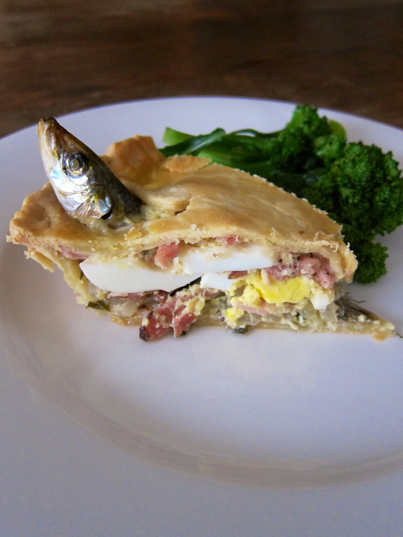 Many variations of the recipe exist which, at it's heart, includes whole sardines/pilchards, egg, bacon, sometimes potatoes, and a white, milk-based sauce all melded together under a crispy shortcrust lid. The positioning of the fish is said to improve the pie's flavour as it allows oils released during cooking to drain back into the filling, although I suspect the main purpose is one of dramatic effect (and there's absolutely nothing wrong with that).